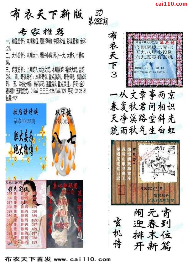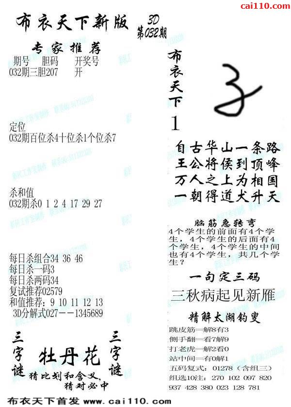 2020年032期福彩3D蓝宝石杀码图谜(原