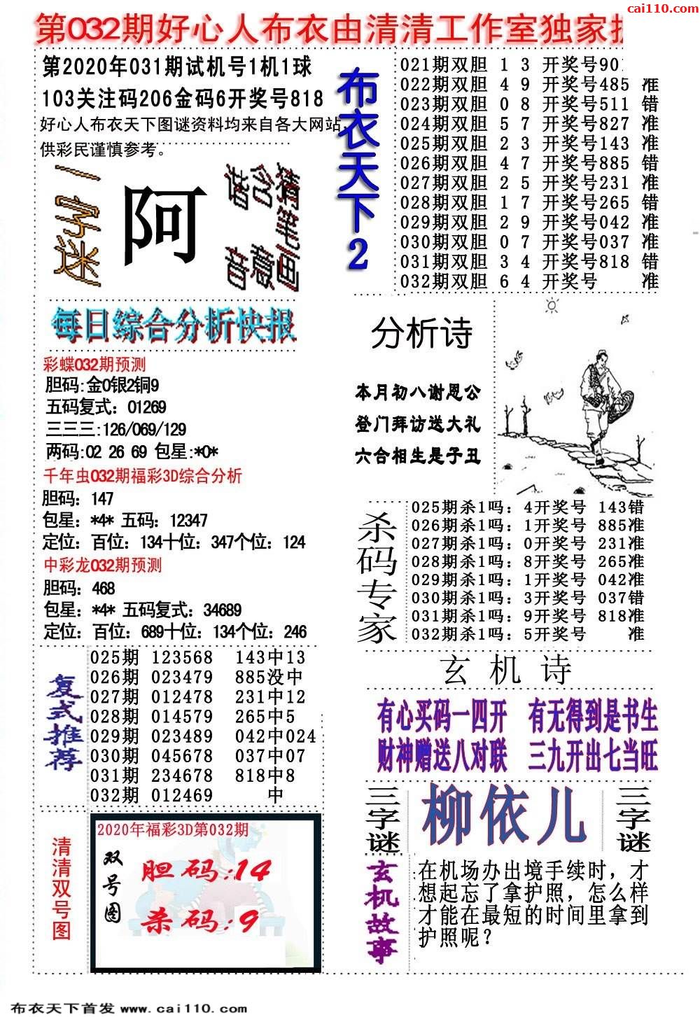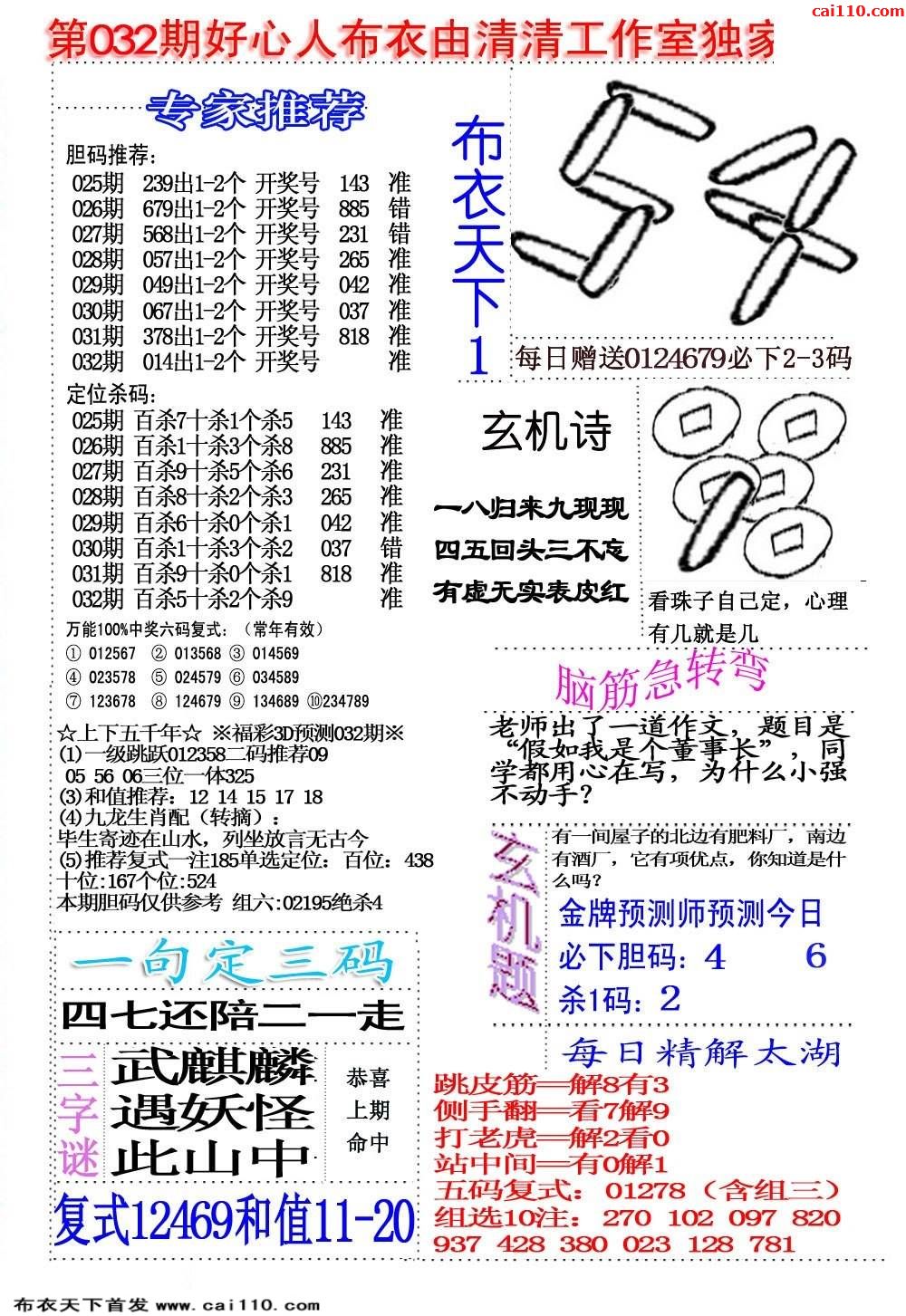 20032期新布衣天下福彩3D布衣图1234