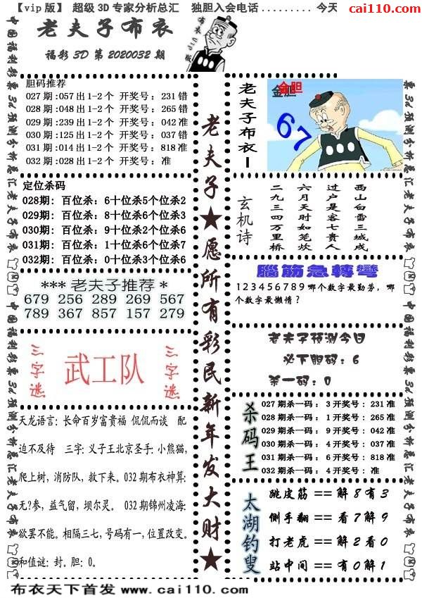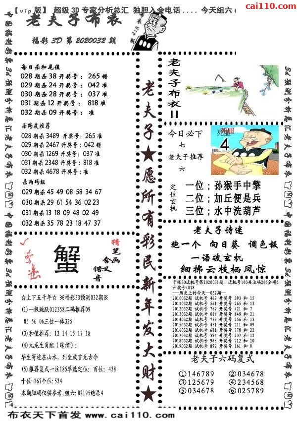 2020年032期福彩3D蓝宝石杀码图谜(原