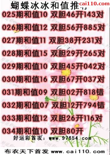 蝴蝶冰冰20年034期3d和值+双胆图(原创