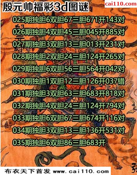 3D殷元帅20年035期布衣天下胆码图(原