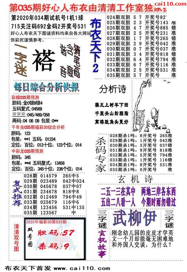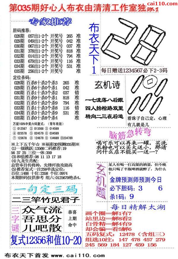 2020年035期福彩3D蓝宝石杀码图谜(原