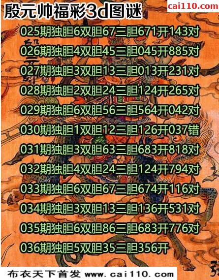 3D殷元帅20年036期布衣天下胆码图(原
