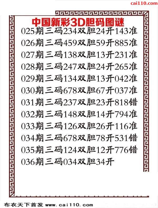中国新彩20年036期福彩3D胆码图谜