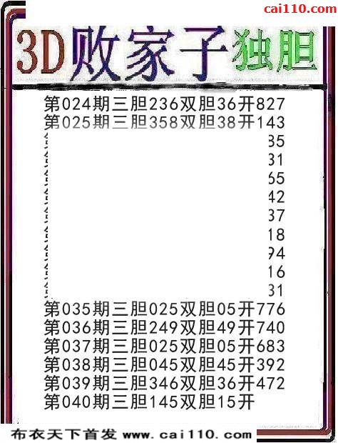 3D败家子20年040期精准双胆福彩图