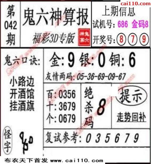 福彩3D20年042期鬼六神算推胆3d图谜