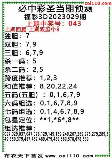 原创彩圣分析029期3D出号规律 上期双胆中3