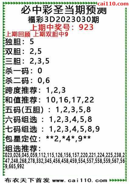 原创彩圣分析030期3D出号规律 上期双胆中9