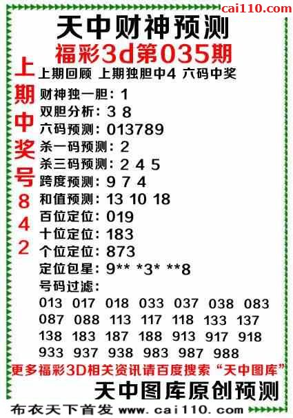 23035期财神3d综合预测分析 上期独胆中4 六码中奖