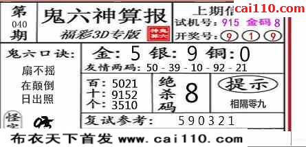 鬼谷神算杀一开奖号3D2023040期